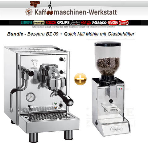 Hochwertiges Bundle bestehend aus Einkreiser ESPRESSO MASCHINE Bezzera BZ09 S PM Semiprofessionell; mit Quick Mill Evo 60 Kaffee Mühle mit Glasbehälter.